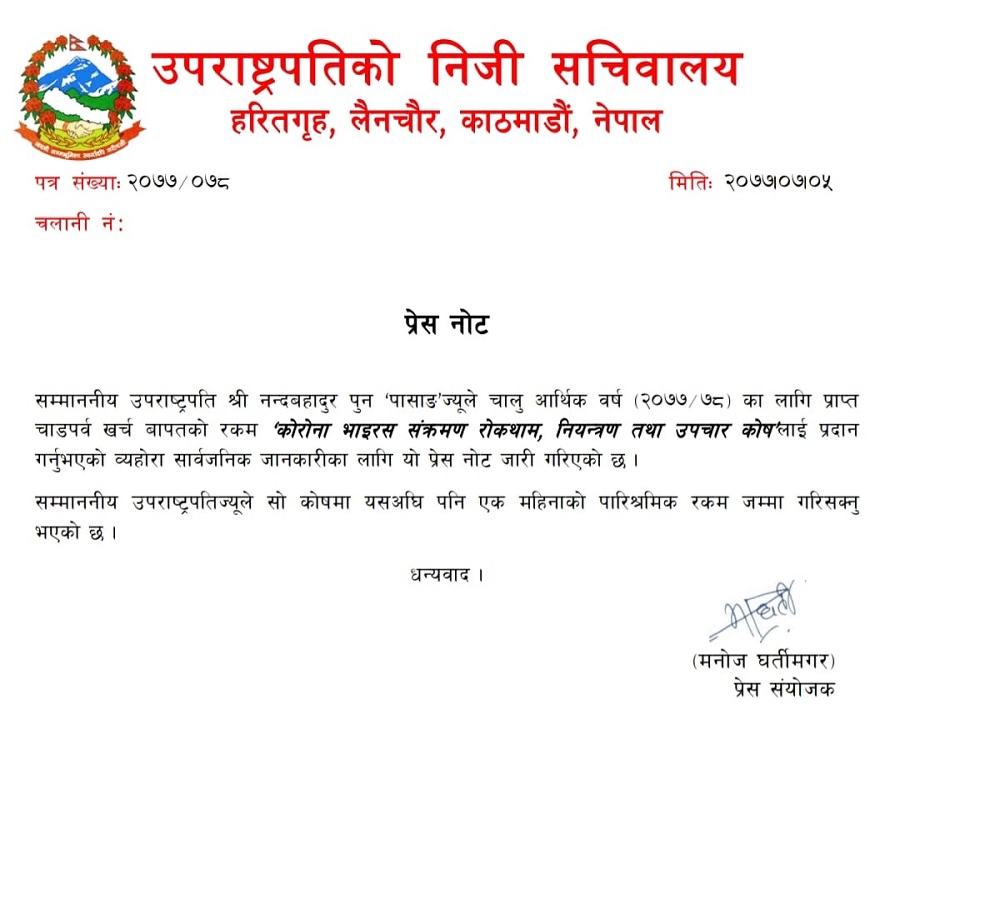 काठमाडौं । उपराष्ट्रपति नन्दबहादुर पुनले चाडपर्व खर्चवापत आफूलाई प्राप्त रकम ‘कोरोना भाइरस संक्रमण रोकथाम, नियन्त्रण तथा उपचार कोष’मा प्रदान गरेका छन् ।