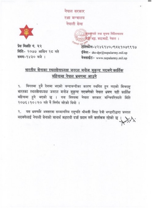 दुवै देशमा भएको बन्दाबन्दीका कारण स्थगित भएको भारतका स्थलसेनाध्यक्षको नेपाल भ्रमण आगामी कात्तिकमा हुने सैनिक जनसम्पर्क तथा सूचना निर्देशनालयले बुधबार प्रेस विज्ञप्तिमार्फत जानकारी दिएको छ ।