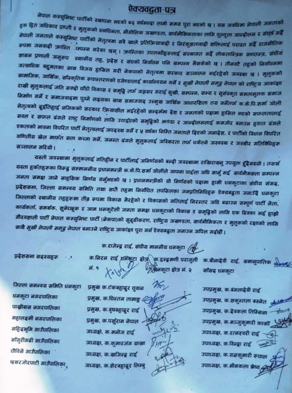 काठमाडौं । धनकुटा जिल्लाका सबै तहका जनप्रतिनिधिहरु सत्तारुढ नेपाल कम्युनिष्ट पार्टी (नेकपा)को प्रधानमन्त्री केपी शर्मा ओली समूहमा खुलेका छन् । संयुक्त ऐक्यवद्धता पत्रमार्फत जिल्लाका संघीय, प्रदेश तथा स्थानीय तहका जनप्रतिनिधि ओली समूहमा खुलेका हुन् ।