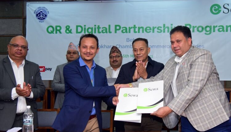कास्की । इसेवा र पोखरा उद्योग वाणिज्य संघबीच विद्युतीय भुक्तानीका लागि सहकार्य भएको छ । पोखरा महानगरपालिकालाई डिजिटल बजार बनाउने उदेश्यका साथ दुई संस्थाबीच सम्झौता भएको हो ।
