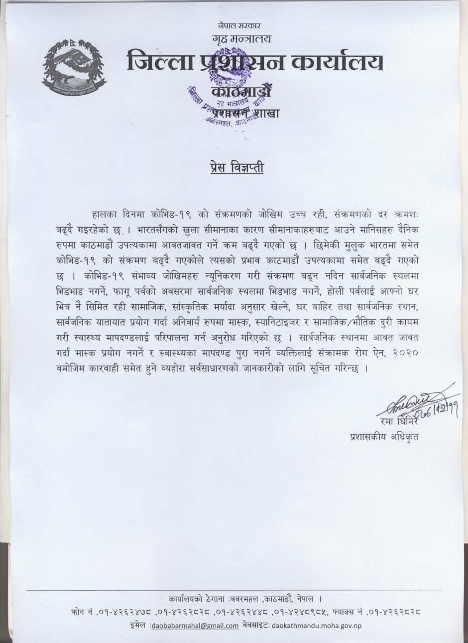 प्रशासनले भारतसँगको खुला सीमानाका कारण सीमा नाकाबाट आउने मानिसहरु दैनिकरुपमा काठमाडौं उपत्यकामा आवतजावत गर्ने क्रम बढ्दै गएको जनाउँदै यस्तो निर्देशन गरेको विज्ञप्तिमा जनाइएको छ ।