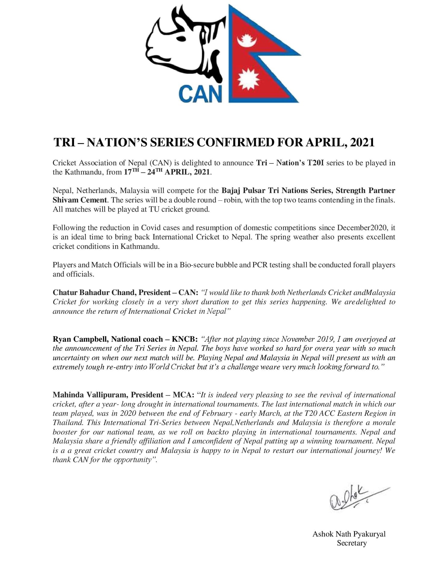 नेपाल क्रिकेट संघ (क्यान)ले शुक्रबार प्रेस विज्ञप्ति जारी गर्दै कीर्तिपुरस्थित त्रिवि क्रिकेट मैदानमा ‘बजाज पल्स त्रिदेशीय सिरिज’ क्रिकेट प्रतियोगिता आयोजना गर्ने जानकारी दिएको हो ।