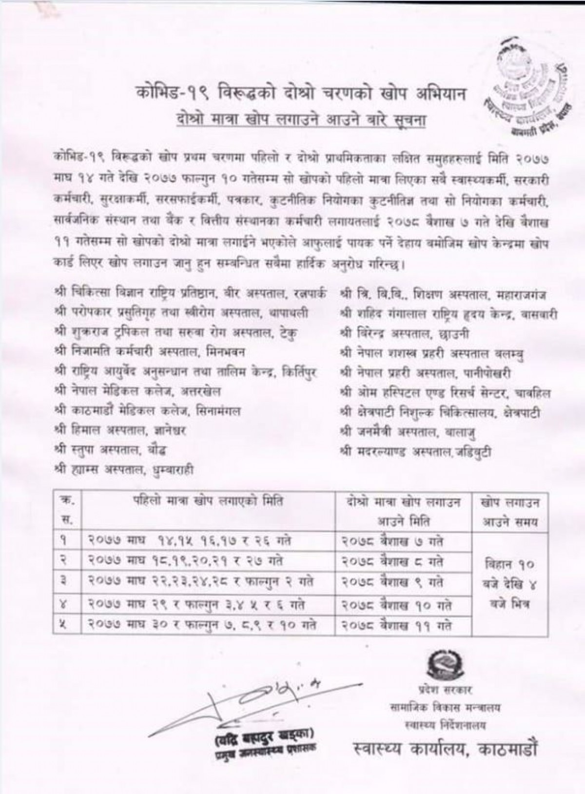 पहिलो चरणमा खोप लगाएकाहरुलाई सरकारले काठमाडौंका विभिन्न १९ स्थानबाट खोप लगाउने स्वास्थ्य कार्यालय काठमाडौंले जनाएको छ ।