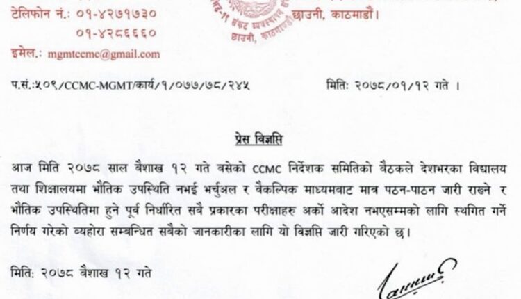 कोभिड–१९ संकट व्यवस्थापन केन्द्र (सिसिएमसी) को आइतबार बसेको बैठकले भौतिक उपस्थित हुने पूर्वनिर्धारित सबै परीक्षा अर्को आदेश नभएसम्मका लागि स्थगित गर्ने निर्णय गरेको छ ।