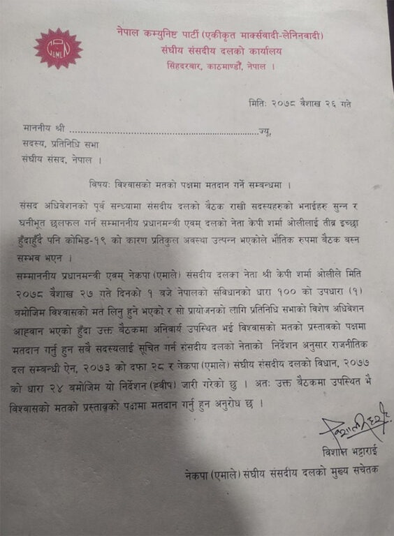 एमाले संसदीय दलका प्रमुख सचेतक विशाल भट्टराईले एमाले सांसद्हरुलाई पत्र लेखी सोमबारको प्रतिनिधिसभा बैठकमा उपस्थित भई प्रधानमन्त्रीलाई विश्वास मत दिन आग्रह गरेका छन् ।
