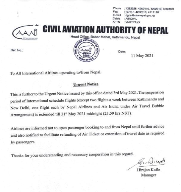 प्राधिकरणले आगामी जेठ १७ (मे ३१) को मध्यरातसम्म अन्तर्राष्ट्रिय उडान बन्द गर्ने निर्णय गरेको हो ।