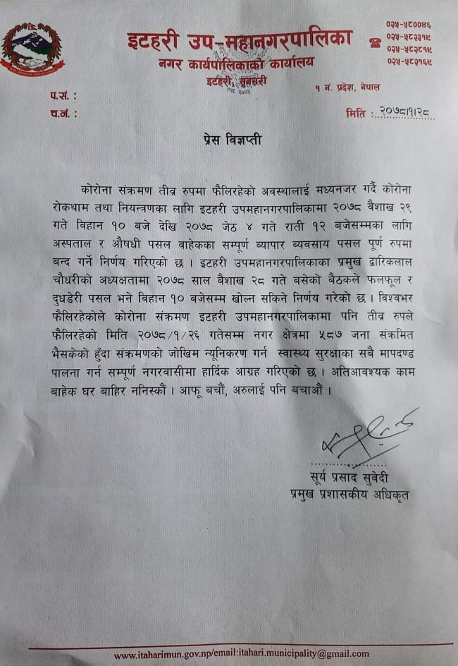 इटहरी । सुनसरीको इटहरी उपमहानगरपालिकाले नगर क्षेत्रमा कोरोना भाइरसकाे संक्रमण दर तीव्ररूपमा बढ्दै गएपछि त्यसकाे राेकथाम तथा नियन्त्रणका लागि औषधि पसल र अस्पतालबाहेक अन्य व्यवसाय सञ्चालनमा रोक लगाउने निर्णय गरेकाे छ ।