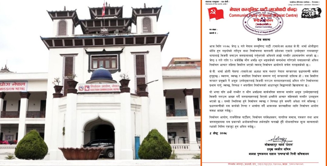 काठमाडौं । नेकपा (माओवादी केन्द्र)ले प्रधानमन्त्री केपी शर्मा ओलीले मौन अवधिमा आफ्ना उम्मेदवारलाई भोट मागेको भन्दै कारबाहीका लागि निर्वाचन आयोग समक्ष माग गरेको छ । पार्टीका अध्यक्ष पुष्पकमल दाहाल ‘प्रचण्ड’का प्रमुख स्वकीय सचिव जोख बहादुर महराले बुधबार साँझ एक विज्ञप्ति जारी गर्दै यस्तो माग गरेका हुन् ।