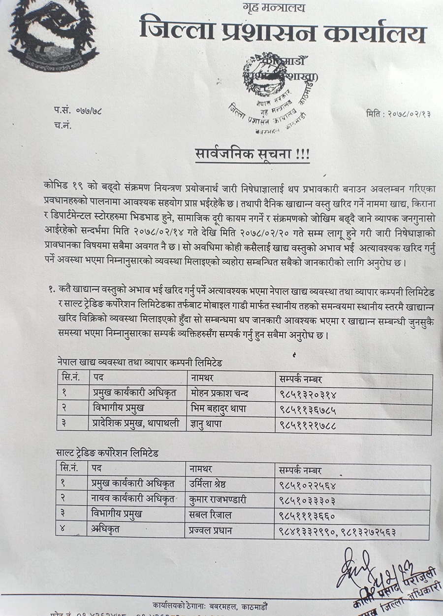 प्रशासनले खाद्यन्न पसलहरुमा भीड बढेको भन्दै एक हप्ता खोल्न नदिने भएको हो । यो निर्णयको चौतर्फी आलोचना भइरहेको छ । यो अवधिमा खाद्यन्न किन्न परे के गर्ने भन्ने प्रश्न उठेपछि काठमाडौं जिल्ला प्रशासनले केही नम्बरहरु उपलब्ध गराएको छ ।