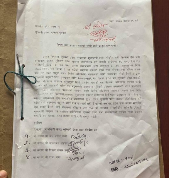 बुटवल । नेकपा (माओवादी केन्द्र)का संसदीय दलका नेता कुलप्रसाद केसीले ४२ सांसद्को हस्ताक्षरसहित आफ्नो नेतृत्वमा नयाँ सरकार गठनका लागि प्रदेश प्रमुख समक्ष दाबी पेस गरेका छन् ।