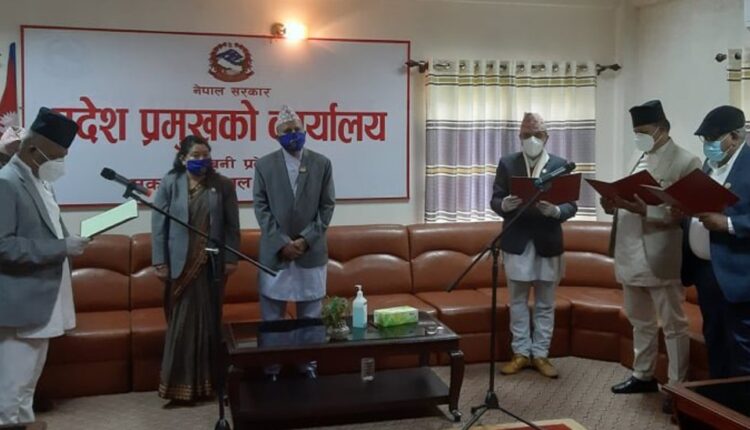 मुख्यमन्त्री शंकर पोखरेलले तेस्रो पटक मन्त्रिपरिषद् विस्तारमा थप भएका तीन मन्त्रीलाई प्रदेश प्रमुख धर्मनाथ यादवले पद तथा गोपनीयताको शपथ गराएका हुन् ।