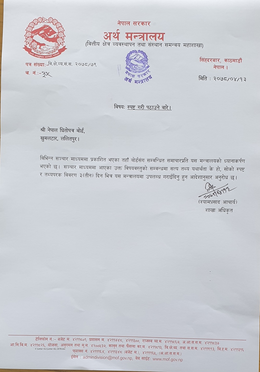 “विभिन्न सञ्चारमाध्यममा प्रकाशित भएका बोर्डसँग सम्बन्धित समाचारप्रति मन्त्रालयको ध्यानाकर्षण भएको भन्दै उक्त विषयवस्तुको सम्बन्धमा सत्यतथ्य यथार्थ के हो, सोको स्पष्ट र तथ्यपरक विवरण तीन दिनभित्र मन्त्रालयमा उपलब्ध गराइदिनहुन आदेशानुसार अनुरोध छ,” पत्रमा भनिएको छ ।