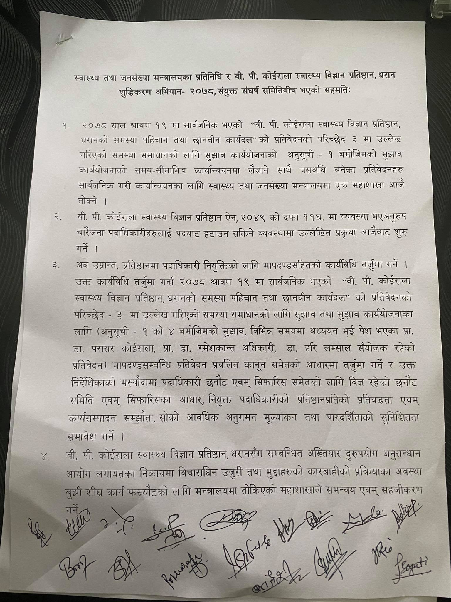 सहमतिपत्रमा सरकारका तर्फबाट स्वास्थ्य तथा जनसंख्या मन्त्रालयका प्रवक्त डा.कृष्णप्रसाद पौडेलसहित सदस्यहरु मान बहादुर बस्नेत र देवराज भण्डारीले हस्ताक्षर गरेका छन् । यस्तै, संघर्ष समितिका तर्फबाट संयोजक डा.एसपी रिमाल, सहसंयोजक डा.विष्णु पोखरेल र १२ जना सदस्यले हस्ताक्षर गरेका छन् ।