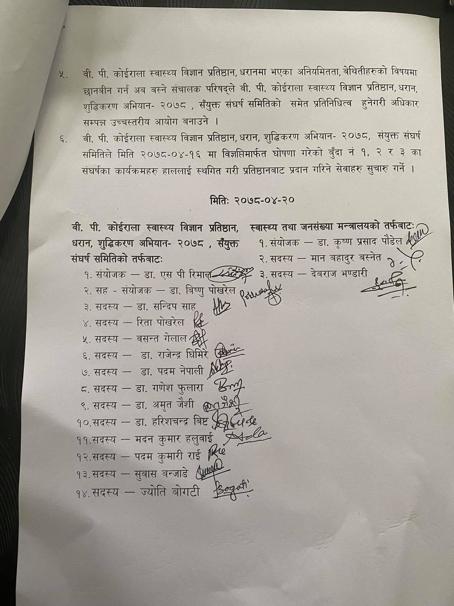 स्वास्थ्य तथा जनसंख्या मन्त्रालयकले डा.कृष्णप्रसाद पौडेलको संयोजकत्वमा वार्ता टोली गठन गरेको थियो । धरान पुगेको उक्त वार्ता टोलीले प्रतिष्ठान शुद्धीकरण अभियान संयुक्त संघर्ष समितिका प्रतिनिधिसँग वार्ता गर्दै ६ बुँदे सहमति गरेको हो ।