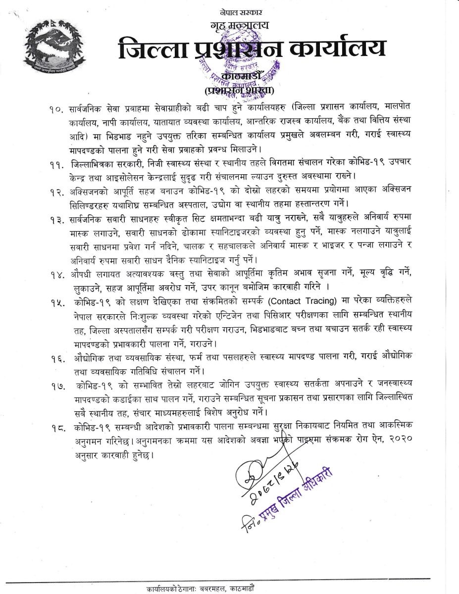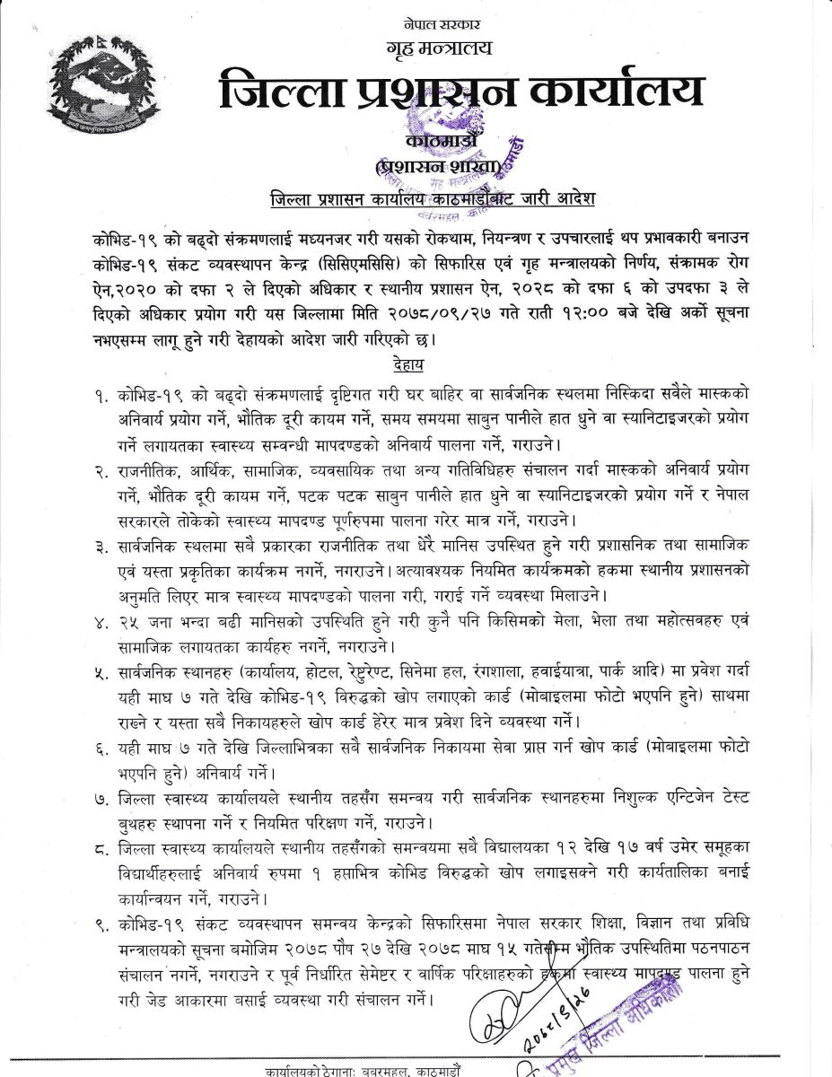 काठमाडौँ, ललितपुर र भक्तपुरका प्रमुख जिल्ला अधिकारीहरूको बैठकले सार्वजनिक स्थानमा २५ जनाभन्दा बढी भेला हुन नपाइने निर्णय गरेको हो । यो निर्णयसँगै भेला, सम्मेलन, जुलुस निकाल्न रोक लागेको छ ।