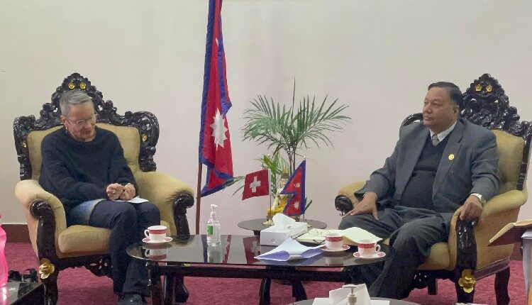 काठमाडौँ । शिक्षा, विज्ञान तथाप्रविधिमन्त्री देवेन्द्र पौडेल र नेपालका लागि स्वीट्जरल्यान्डका राजदूत एलिसावेथ भोन क्यापलरबीच शिष्टाचार भेटवार्ता भएको छ । नेपालको शिक्षा, गरिबी न्यूनीकरण र ग्रामीण विकासका बारेमा मंगलबार सिंहदरबारमा कुराकानी भएको हो ।