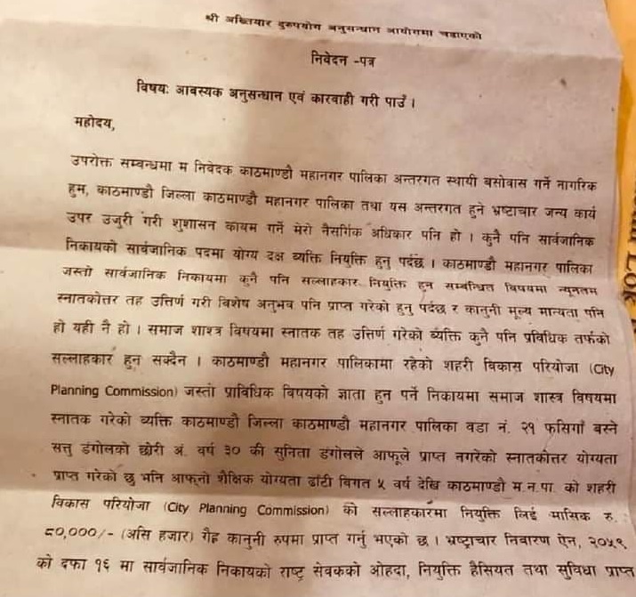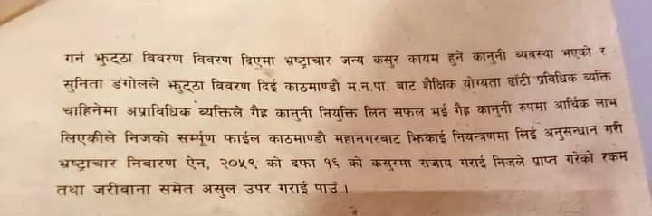 काठमाडौँ, २० वैशाख । वैशाख ३० गतेको स्थानीय तह निर्वाचनका लागि काठमाडौँ महानगरपालिकाको उपप्रमुखमा नेकपा (एमाले)बाट उम्मदेवार बनेकी सुनिता डंगोलविरुद्ध अख्तियार दुरुपयोग अनुसन्धान आयोगमा उजुरी परेको छ ।