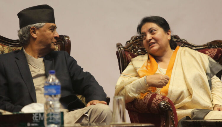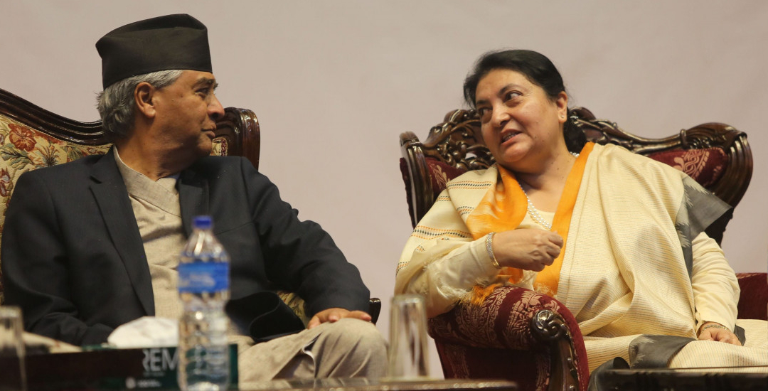 काठमाडौँ, १४ असार । राष्ट्रपति विद्यादेवी भण्डारी र प्रधानमन्त्री शेरबहादुर देउवाबीच भेटवार्ता भएको छ । राष्ट्रपति भण्डारीसँगको भेटवार्ताका लागि प्रधानमन्त्री देउवा मंगलबार साँझ शीलत निवास पुगेका थिए ।