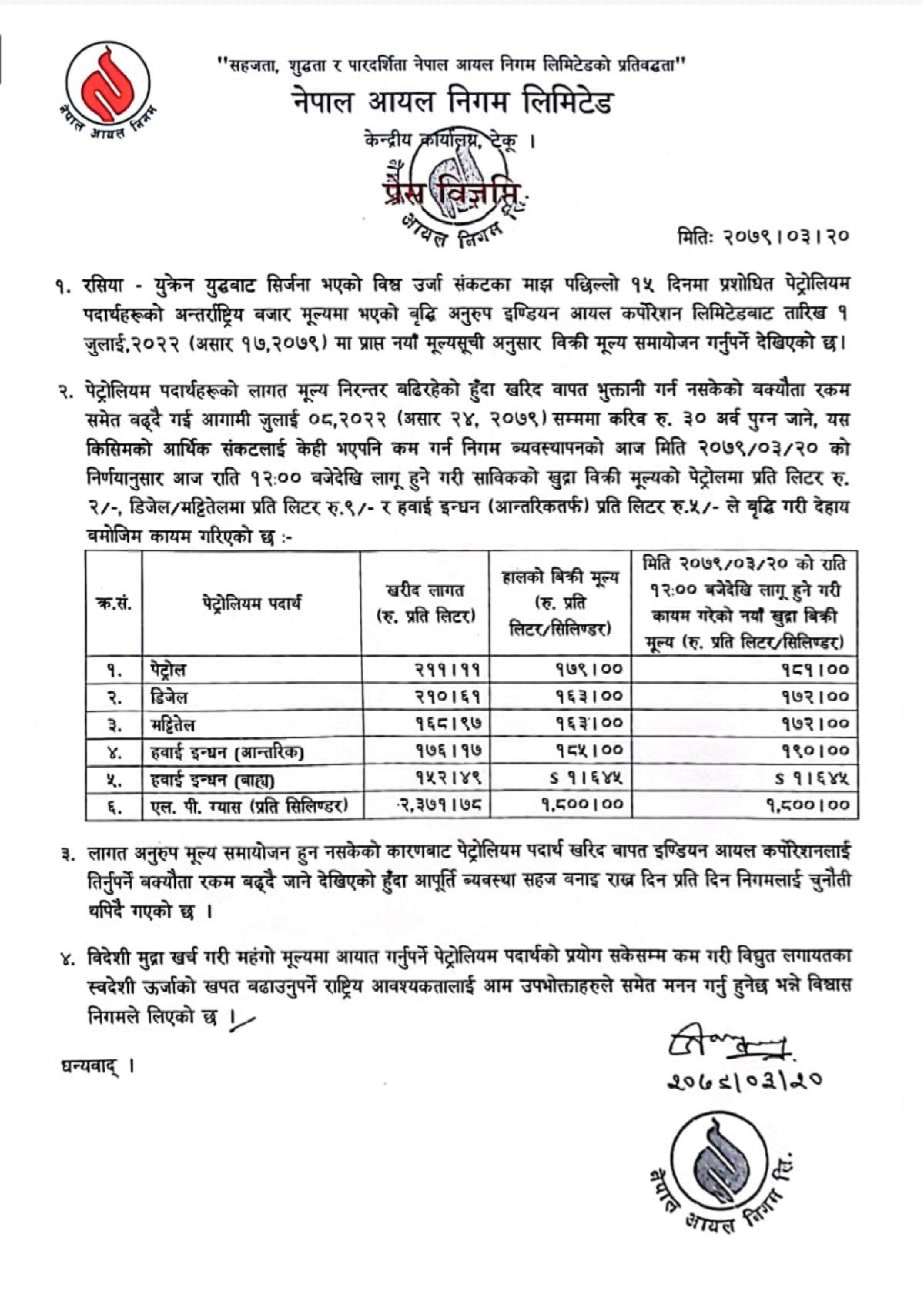 निगमले पेट्रोलमा २ रुपैयाँ, डिजेल तथा मट्टितेलमा ९ रुपैयाँ र हवाई इन्धन आन्तरिकमा पाँच रुपैयाँ बढाएको हो ।