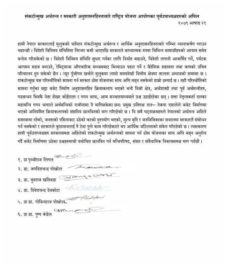 काठमाडौँ, २२ असार । राष्ट्रिय योजना आयोगका ६ जना पूर्वउपाध्यक्षहरुले बजेट निर्माणका क्रममा अनुशासनहीन क्रियाकलाप भएको भन्दै छानबिन गर्न माग गरेका छन् ।
