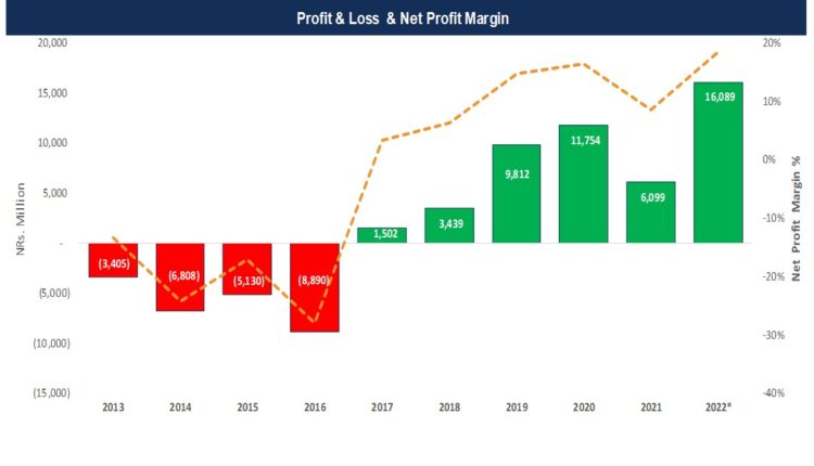 काठमाडौँ, २५ साउन । नेपाल विद्युत् प्राधिकरणको वार्षिक नाफा करिब १६४ प्रतिशतले वृद्धि भएको छ । आर्थिक वर्ष २०७७/७८ मा ६ अर्ब १० करोड खुद नाफामा सीमित भएको प्राधिकरणले आव २०७८/७९ मा नाफालाई बढाएर १६ अर्ब ९ करोड रुपैयाँ पुग्ने प्रक्षेपण गरेको छ ।