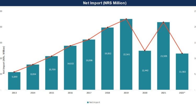 आव २०७७/७८मा २१ अर्ब ८२ करोड रुपैयाँको विद्युत आयात भएको थियो । आव २०७८/७९ मा आयात घटेर १५ अर्ब ४५ करोड रुपैयाँमा झरेको छ । प्राधिकरणले आयात गरेको विद्युत्‌बाट निर्यात गरेको विद्युत् घटाउँदा खुद आयात एक अर्ब ५ करोड युनिट हुन्छ । रकमका आधारमा ११ अर्ब ५८ करोड रुपैयाको मात्र खुद आयात भएको छ । प्रणालीमा उपलब्ध ऊर्जामध्ये खुद आयातको हिस्सा ९.४९ प्रतिशतमा झरेको छ ।