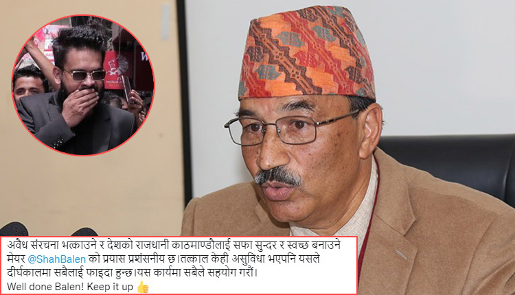‘अवैध संरचना भत्काउने र देशको राजधानी काठमाडौँलाई सफा सुन्दर र स्वच्छ बनाउने मेयर बालेन्द्र साहको प्रयास प्रशंसनीय छ,’ थापाले आज सामाजिक सञ्जाल ट्वीटरमा लेखेका छन् ।