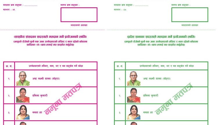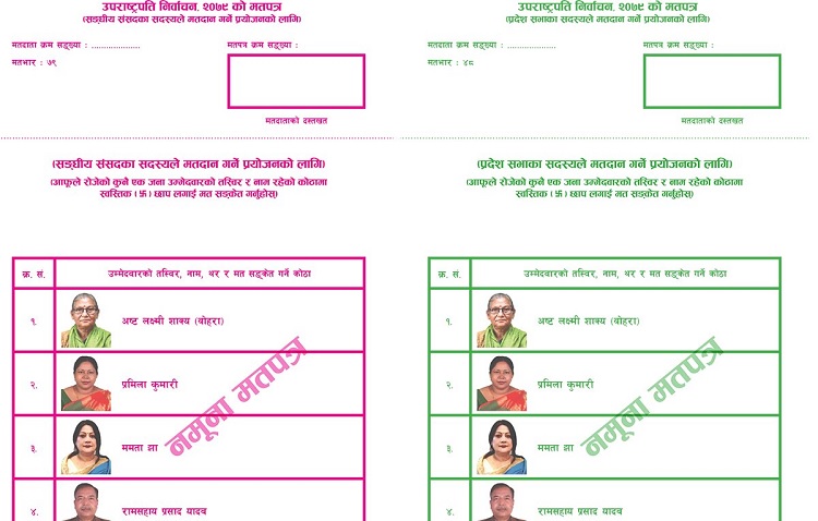 काठमाडौँ, १ चैत । निर्वाचन आयोगले उपराष्ट्रपति निर्वाचनका लागि नमुना मतपत्र सार्वजनिक गरेको छ । आयोगले संघीय संसद्का सदस्य र प्रदेशसभा सदस्यका लागि छुट्टाछुट्टै मतपत्रको व्यवस्था गरेको छ ।