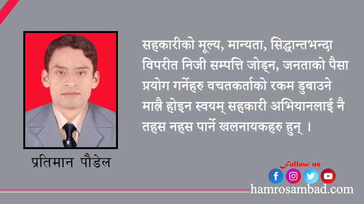 विभागले देशभर कार्यक्षेत्र दिएर सहकारीलाई देशभर व्यवसाय गर्न अनुमति दियो, त्यही अनुमतिलाई उनीहरुले अवसरका रुपमा प्रयोग गरेर केही सहकारीहरुले जनताको ठुलो धनराशी आफ्नो निजी व्यवसायमा लगाए । सहकारीको मूल्य, मान्यता, सिद्धान्तभन्दा विपरीत निजी सम्पत्ति जोड्न, जनताको पैसा प्रयोग गर्नेहरु वचतकर्ताको रकम डुबाउने मात्रै होइन स्वयं सहकारी अभियानलाई नै तहस नहस पार्ने खलनायकहरु हुन् । यिनलाई सरकारले कडाइका साथ कारबाही गर्नुपर्छ र वचतकर्ताको सम्पूर्ण फिर्ता गर्नुपर्छ ।