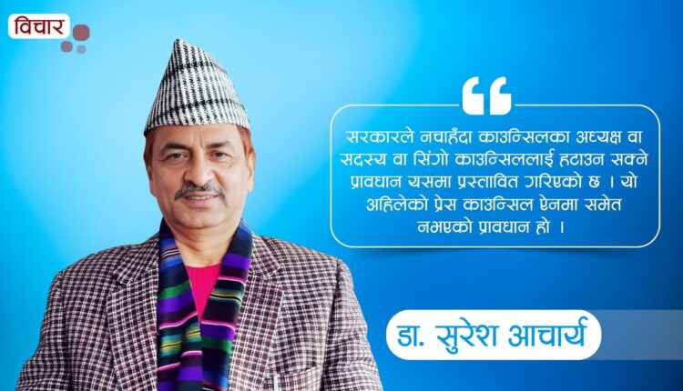 दुर्भाग्यवश संसद्मा प्रवेश गर्दैगर्दा यसको मूलभूत मान्यता नै केही बाँकी रहेनछ । राज्यसत्ताले यसलाई आफू अनुकूल हुने गरी समितिले तयार गरेको विधेयकलाई ध्वस्त पारेर संसदमा पुर्याएको रहेछ । नेपालमा प्रेस काउन्सिलको स्थापना पञ्चायती सत्तासँगै भयो र उसले यो संस्थालाई राजनीतिक व्यवस्थाका विपक्षमा जान खोज्ने पत्रकारविरुद्ध प्रयोग गर्न सकिने निकायका रुपमा खडा गर्न प्रयत्न गरिरह्यो । सर्वोच्च अदालतका बहालवाला न्यायाधीशको अध्यक्षतामा सरकारले चाहेका मानिस राखेर यसको गठन गर्ने गरियो । २०४७ साल यता पनि सरकारले आफूखुसी नियुक्त गर्ने संस्थाका रुपमा यो रहँदै आएको छ । यसपटक सरकारले संसदमा प्रस्ताव गरेको विधेयक त्यो भन्दा कमजोर रुपमा प्रस्तुत गरिएको छ । प्रेस काउन्सिललाई मिडिया काउन्सिलमा रुपान्तरण गर्नुको औचित्यमा नै प्रश्न उठाएको छ ।