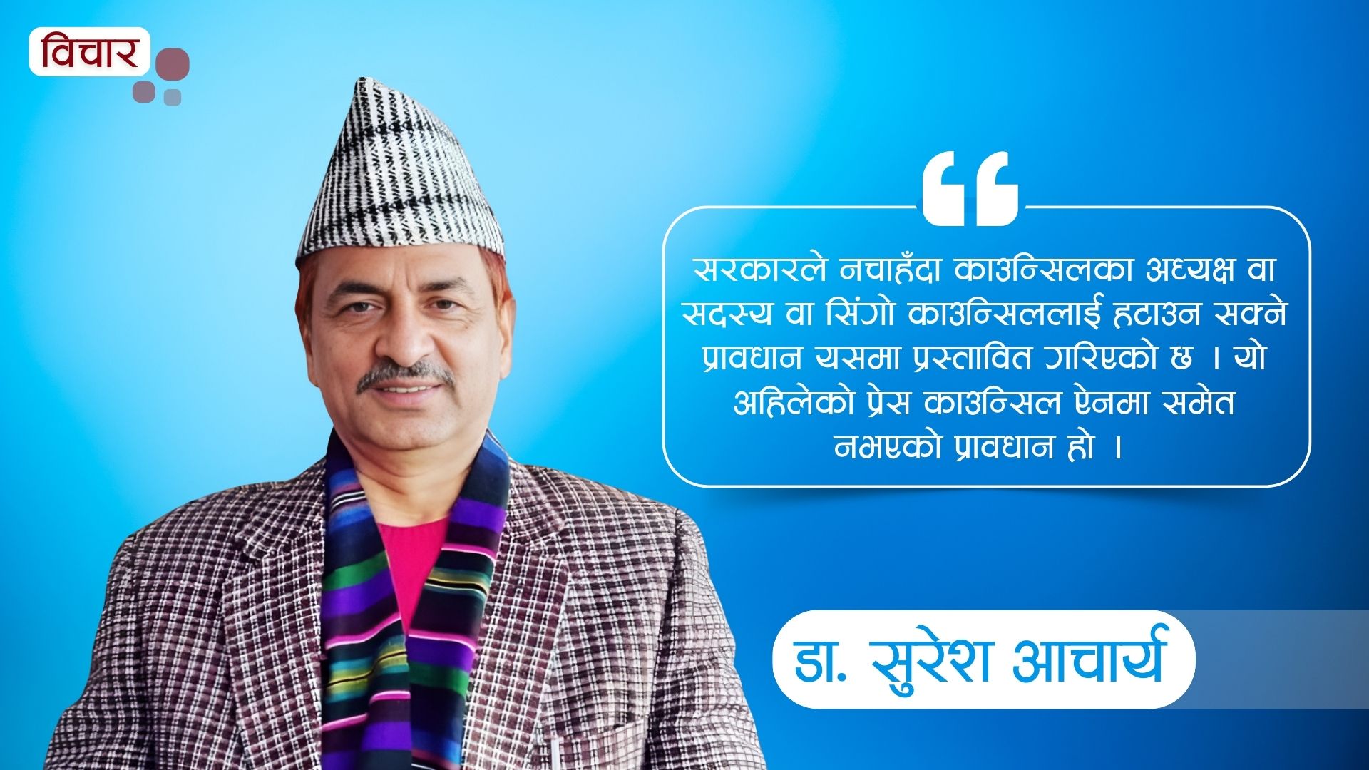 सरकारले मिडिया काउन्सिलसम्बन्धी विधेयक राष्ट्रिय सभामा पेस गरेको छ । यतिबेला यो विधेयक विधायन समितिमा छलफलमा छ । यो त्यही विधेयक हो, जसका लागि अघिल्लो वर्ष सरकार आफैँले एउटा उच्चस्तरीय समिति बनाएर मस्यौदा गर्न लगाएको थियो । त्यो समितिमा नेपाल पत्रकार महासंघका अध्यक्षसहित तीन पूर्वअध्यक्ष र एक विज्ञसहित पाँच जना थिए । त्यो समितिको संयोजक रहेर बुझाएको विधेयकको मस्यौदा संसद्मा पुग्दा त्यसको मूल भावनालाई नै मारिएको पाएँ । भताभुंग र लथालिंग पारिएको विधेयकका बारेमा विधायन समितिमा फेरि विज्ञ भएर विचार राख्नु पर्दा कतिपय बेला संयम कायम गर्न कठिन पर्यो ।