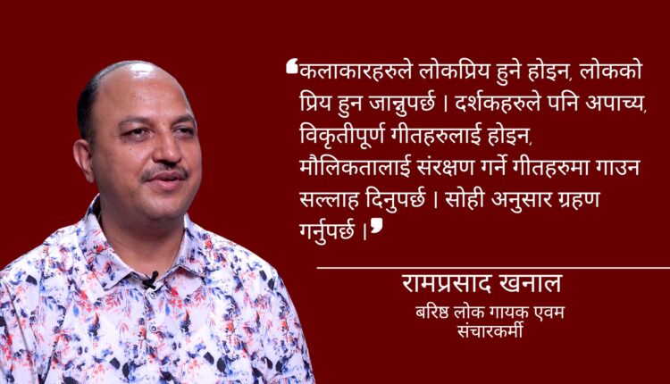 म एक लोक गायक हो, त्यो भनेको लोकको गायक, लोक भनेको समाज, जनता हो । लोकले मन पराउने गीत गाउने हो । तिज गीत गाएपनि वा दोहोरी गीत भए पनि । दोहोरी भनेर फोहोरी गीत गाएको पाइन्छ । बिजोग छ अवस्था । तर, यति भनिरहँदा राम्रा गीतहरु पनि आएका छन् । राम्रो पनि भइरहेको छ । गीत संगीतको विकास पनि भइरहेको छ ।, गीत छनोट गरेर अघि बढ्नुपर्छ । कलाकार र दर्शक वा स्रोतहरु सुध्रिनु पर्छ ।