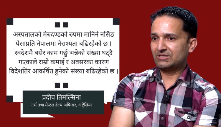 नेपालमा अस्पतालको मेरुदण्डको रुपमा मानिने नर्सिङ पेसाप्रति नैराश्यता बढिरहेको तिमल्सिनाको गुनासो छ । स्वदेशमै बसेर काम गर्छु भन्नेको संख्या घट्दैछ जाँदा विदेशमा राम्रो कमाइ र अवसरका कारण विदेशतिर आकर्षित हुनेको संख्या बढिरहेको अवस्था रहेको उहाँ बताउनुहुन्छ ।