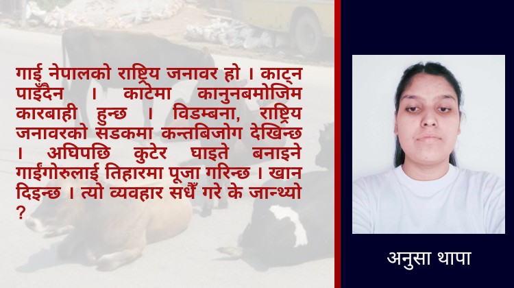 अन्य मुलुकले आफ्नो राष्ट्रिय जनावरको संरक्षण गरेका छन् । तर, हामीकहाँ राष्ट्रिय जनावर कुटाइ खाँदै भोकभोकै हिँड्नुपरेको छ । सरकारले गाईवस्तु सडकमा छोड्नेलाई कारबाही गर्न सकेको छैन । राज्य होस् या सर्वसाधारण, सबैको द्वैध चरित्र छ । यिनीहरुको ‘देखाउने दाँत एउटा र चपाउने दाँत अर्को’ छ ।