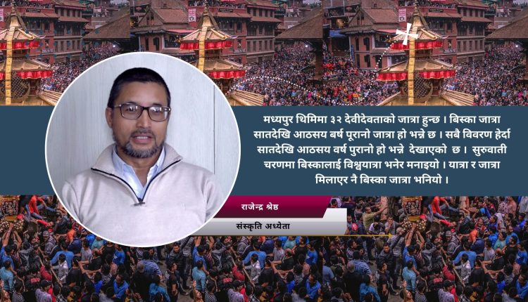 अभिलेखमा जाने हो भने बिस्का जात्रालाई बिस्केट जात्रा भनेर उल्लेख गरेको पाइँदैन । बरु बिस्कात्व जात्रा भनेर भनिएको छ । यसलाई विभिन्न स्वरुपले अथ्र्याउने गरे पनि यसको मौलिक नाम भनेको बिस्का जात्रा नै हो । बिस्का जात्रामा विशेष गरेर विभिन्न खालका संस्कृतिक क्रियाकलापहरु सम्पन्न हुन्छन् भक्तपुर र मध्यपुरमा । मध्यपुरकै कुरा गर्दा चैत मसान्तको ८ दिन अगाडिदेखि यसको विभिन्न क्रियाकलापहरु सञ्चालन हुन्छ । जात्रा गरिने देवीदेवताहरुको गहनाहरु निकाल्ने, गहनाहरु सफा गर्ने, पूजा गर्ने, जात्रा गर्ने क्रममा कुनै खालको बाधा नहोस् भनेर नगरलाई विभिन्न तान्त्रिक विध्यामार्फत् सुरक्षा प्रदान गर्ने किसिमका क्रियाकलापहरु गरिन्छ । समुदाय एवम् राज्यस्तरबाट मन्दिरहरु सजाउने, धिंमे बाजा लगायतका बाजाहरु प्रशिक्षण गर्ने कार्य गरिन्छ । तर, बिस्का जात्रामा योसी ठड्याएर जात्रा प्रारम्भ हुन्छ भने योसी ढालेपछि जात्रा सम्पन्न भएको मानिन्छ । यस्तो चलन धेरै ठाउँमा छ ।