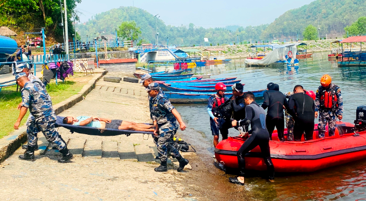 दुर्घटनामा परी तालमा हराइरहेका एक जनालाई गोताखोर टोलीले उद्धार गर्यो । ज्यानको पर्वाह नगरी तालमा हेलिएका उद्धार टोलीले यात्रुको जीवन बचाए । यो काल्पनिक घटना–दृश्य कास्कीको पोखरा महानगरपालिका–३१ स्थित बेगनास तालको हो । पोखरास्थित सशत्र प्रहरी बल, मुक्तिनाथ बाहिनीको संयोजन र कालिका गणको आयोजनामा आज विपद् प्रतिकार्य नमुना अभ्यासअन्तर्गत जल उत्पन्न प्रकोपसम्बन्धी उद्धार अभ्यास गरिएको हो । गण्डकी प्रदेश विपद् व्यवस्थापन टिमअन्तर्गत रहेका गोताखोर, तुइन रोप उद्धारकर्तालगायत उक्त अभ्यासमा सहभागी थिए ।