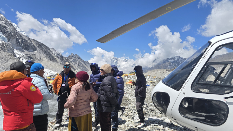 पर्यटकीय यामका सन्दर्भमा आरोहीहरुको अवस्थाबारे प्रत्यक्ष जानकारी लिन र शान्ति सुरक्षासम्बन्धी अवस्था अवलोकन गर्न आज उहाँहरु खुम्बु पासाङल्हामु गाउँपालिका–४ स्थित सगरमाथा आधार शिविर पुग्नुभएको हो । दुवै मन्त्रीलाई लिएर गएको हेलिकप्टर बिहानै खुम्बु क्षेत्रमा अवतरण गरेको थियो ।