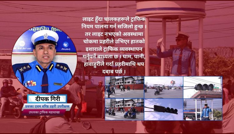 ‘ट्राफिक प्रहरीले लाइट मर्मत गर्ने न बजेट पाउँछ, न प्राविधिक जनशक्ति नै,’ प्रवक्ता दीपक गिरीले भन्नुभयो, ‘बिग्रिएका लाइट सडक विभाग र सम्बन्धित महानगरपालिकाले मर्मत गर्नुपर्छ ।’