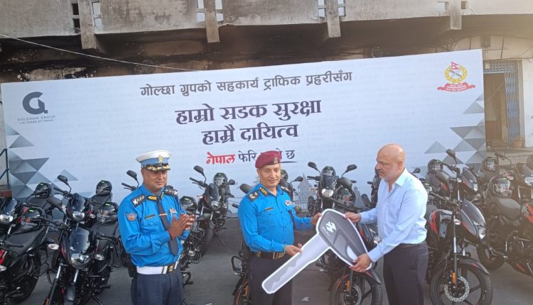 वर्तमान परिस्थितिमा स्रोत साधनको अभावले ट्राफिक व्यवस्थापन तथा सुरक्षित आवागमनमा परिरहेको असरलाई मध्यनजर गर्दै गोल्छा ग्रुपले मंगलबार काठमाडौँ उपत्यका ट्राफिक प्रहरी कार्यालयमा आयोजित एक कार्यक्रमका बीच २० थान (पल्सर १५० सिसी) मोटरसाइकल प्रदान गरेको ट्राफिक प्रहरी प्रमुख एवम् वरिष्ठ प्रहरी उपरीक्षक नवराज अधिकारीले जानकारी दिनुभयो ।