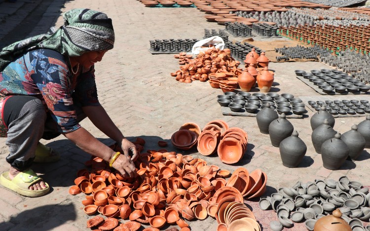 भादगाउँ, २९ असोज । भक्तपुरको च्याम्हसिंहकी इन्दिरा प्रजापति पछिल्लो बिहान ४ बजे नै उठ्नुहुन्छ । उहाँ तिहारको लागि आवश्यक माटोका भाँडा बनाउन कुम्हाःया घचा (कुम्हालेको चक्रं)मा बस्नुहुन्छ । तिहार नजिकिएसँगै इन्दिरालाई माटोको पालालगायतका सामाग्री बनाउन भ्याइनभ्याइ छ । त्यसैले उहाँको दैनिक दिनचर्या बिहान ४ बजेदेखि नै सुरु हुन्छ । एकल महिला भएका कारण पनि उहाँलाई बेफुर्सदीले सताएको हो ।