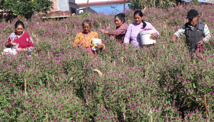 भक्तपुर, ३० असोज । मखमली र सयपत्री फूलले ढकमक्क बनेको बारीको पाटोदेखि धान फल्ने खेतका गह्राहरूमा बिहानीको पारिलो घामको न्यानोमा भक्तपुरका महिलाहरूलाई फूल टिप्न भ्याइनभ्याई छ । बिहान उठेर फूल टिपेर घरमा पुग्न नपाई पाकेको खाना खाएर फेरि आँगन र पिढीँको डिलमा बस्दै महिलाहरू सियो धागो मिलाउँदै त्यही फूलका माला गाँस्न अभ्यस्त देखिन्छन् ।