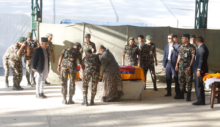 काठमाडौँ, ३ कात्तिक । विपिन जोशीको पार्थिव शरीर आज अपराह्न इजरायलबाट काठमाडौँ ल्याइएको छ । त्रिभुवन अन्तर्राष्ट्रिय विमानस्थलमा आयोजित शोकसभामा प्रधानमन्त्री सुशीला कार्कीले स्व जोशीप्रति श्रद्धाञ्जली अर्पण गर्दै उहाँको आत्माको चिरशान्तिको कामना गर्नुभयो । उहाँले शोकसन्तप्त परिवारजनमा समवेदना व्यक्त गर्नुभयो ।