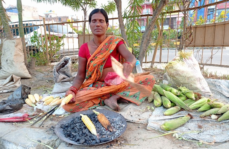 करिब ३०÷३५ किलोमिटर धाएर ल्याएको मकै सडकपेटीमै पसारेर हातमुख जोर्ने बन्दोबस्त गर्ने दासलाई त्यसरी आर्जेको एक गाँस खान पनि निकै हतार हुन्छ । “मकै लिन जाँदै एउटा थैलामा खानेकुरा बोकेर हिँड्छु, यहाँ बर्दिबासको सडकपेटीमा मकै बिसाउनासाथ ग्राहक झुम्मिन्छन्, आफू खानेकुरा खानु कि ग्राहक हेर्नु हुन्छ”, दास भन्नुहुन्छ, “सधैँको राख्ने ठाउँबाट तावा र कोइला निकाल्छु, हतारहतार दुई गाँस खाएर मकै पोल्न थाल्छु ।”