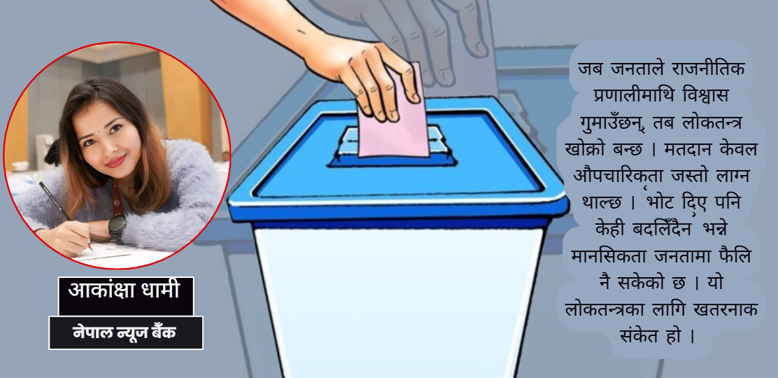 जब जनताले राजनीतिक प्रणालीमाथि विश्वास गुमाउँछन्, तब लोकतन्त्र खोक्रो बन्छ । मतदान केवल औपचारिकता जस्तो लाग्न थाल्छ । ‘भोट दिए पनि केही बदलिँदैन’ भन्ने मानसिकता जनतामा फैलि नै सकेको छ । यो लोकतन्त्रका लागि खतरनाक संकेत हो ।