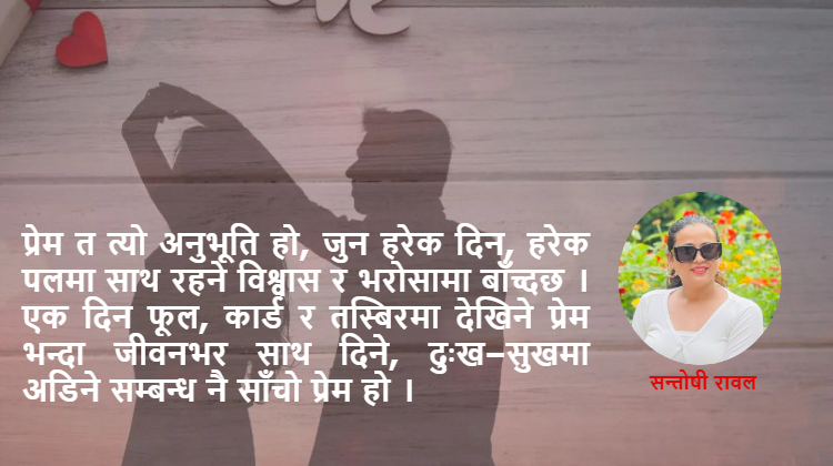 तर, प्रेम केवल एक दिनमा सीमित हुँदैन । प्रेम त त्यो अनुभूति हो, जुन हरेक दिन, हरेक पलमा साथ रहने विश्वास र भरोसामा बाँच्दछ । एक दिन फूल, कार्ड र तस्बिरमा देखिने प्रेम भन्दा जीवनभर साथ दिने, दुःख–सुखमा अडिने सम्बन्ध नै साँचो प्रेम हो ।