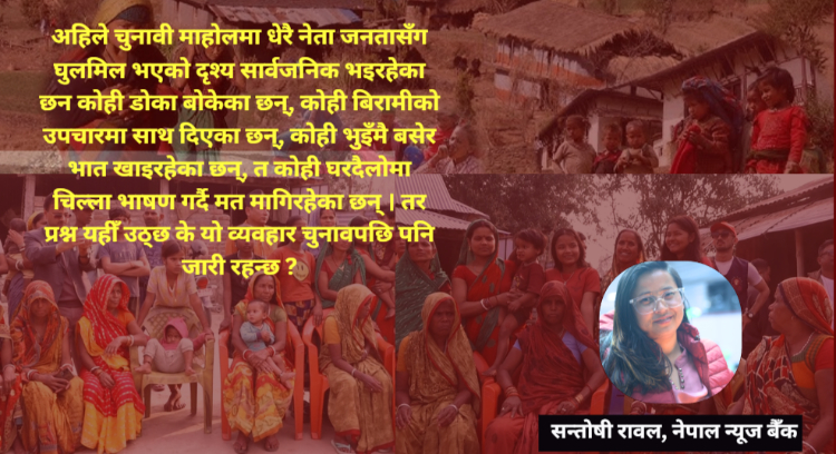 सामाजिक सञ्जालदेखि गाउँघरका चौतारासम्म चुनावी बहस सुरू भइसकेको छ । तर, मूल प्रश्न भने अझै पनि उही छ, के यसपटक पनि चुनावपछि जनताको अवस्था उस्तै रहने त होइन ? चुनावको समयमा नेताहरू जनतामाझ पुग्ने दृश्य हरेकपटक दोहोरिन्छ । कोही डोको बोकेर खेतबारीमा पुगेका छन् । कोही जनतासँगै भुइँमै बसेर खाना खाइरहेका छन्, कोही बिरामीको उपचारमा सघाइरहेका तस्बिर र भिडिओ सार्वजनिक भइरहेका छन् । जसले उम्मेदवारहरु ‘जनतासँग नजिक’ भएको जस्तो सन्देश दिन्छ ।
