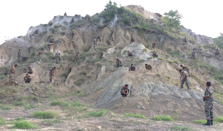 सिराहा, सप्तरी, सिन्धुली, उदयपुर, नवलपरासी, दाङ र सुनसरी जिल्लामा एक हजार १४४ मिटर तटबन्ध निर्माण गरी स्थानीय बस्ती तथा कृषि क्षेत्र संरक्षणमा महत्त्वपूर्ण योगदान दिइरहेको छ । वृक्षरोपण कार्यलाई प्रभावकारी बनाउन लागि गणहरूमा ‘सेड हाउस’ स्थापना गरी आवश्यकतानुसार बिरुवा उत्पादन गर्दै आइरहेको सैनिक प्रवक्ता बस्नेतले जानकारी दिनुभयो ।