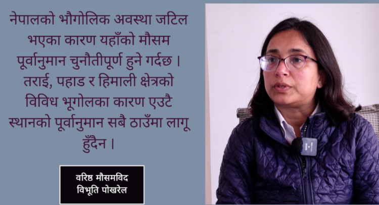 नेपालको भौगोलिक अवस्थाका कारण मौसम पूर्वानुमान चुनौतीपूर्ण हुने उहाँले बताउनुभयो । तराई, पहाड र हिमाली क्षेत्रको विविध भूगोलका कारण एउटै स्थानको पूर्वानुमान सबै ठाउँमा लागु नहुने उहाँको भनाइ छ । “हाम्रो भूगोल जटिल छ, त्यसैले पूर्वानुमान पनि त्यहीँअनुसार चुनौतीपूर्ण हुन्छ,” उहाँले स्पष्ट पार्नुभयो ।
