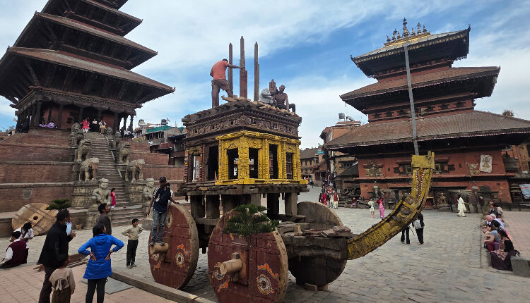 टौमढीस्थित पाँचतले मन्दिर प्राङ्गनमा प्यागोडा शैलीको तीन तले रथ निर्माण कार्य तीव्र गतिमा भइरहेको गुठी संस्थान भक्तपुरका प्रमुख आनन्दप्रसाद कर्माचार्यले जानकारी दिनुभयो । उहाँले भैरवको रथ निर्माण सम्पन्न भए लगत्तै भद्रकालीको रथ निर्माण सुरू गरिने जानकारी दिँदै अहिलेसम्म भैरव रथ निर्माणको क्रममा विभिन्न आकारका काठ तयार गर्ने, पाङ्ग्राहरु जोड्ने, बिग्रिएका सामानको मर्मत गर्ने, भाँचिएका धुराहरु मर्मत गर्ने, चुकुलहरु फेर्ने, नयाँ आसी जडान गर्ने, छानो मर्मत गर्ने र रथ निर्माण गर्ने कार्य तीव्र गतिमा भइरहेको बताउनुभयो ।