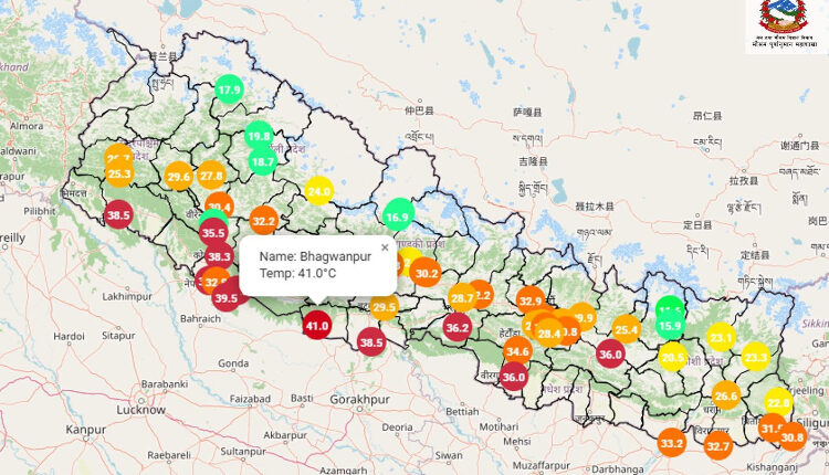 विभागले आज दिउँसो सार्वजनिक गरेको तथ्याङ्कअनुसार कपिलवस्तुमा ४१ डिग्री सेल्सियस र बाँकेमा ३९ डिग्री सेल्सियस तापक्रम पुगेको छ । मधेस प्रदेशलगायत बागमती, गण्डकी, लुम्बिनी र सुदूरपश्चिम प्रदेशका तराई क्षेत्र तथा उपत्यका र खोँचहरूमा दिन तातो भएको, सुदूरपश्चिम र लुम्बिनी प्रदेशका पश्चिमी तराई क्षेत्रमा ‘लु’ चल्ने सम्भावना रहेको विभागले जनाएको छ । पछिल्लो सूचनामा अद्यावधिक रहन तथा आवश्यक सतर्कता अपनाउन विभागले अनुरोध गरेको छ ।